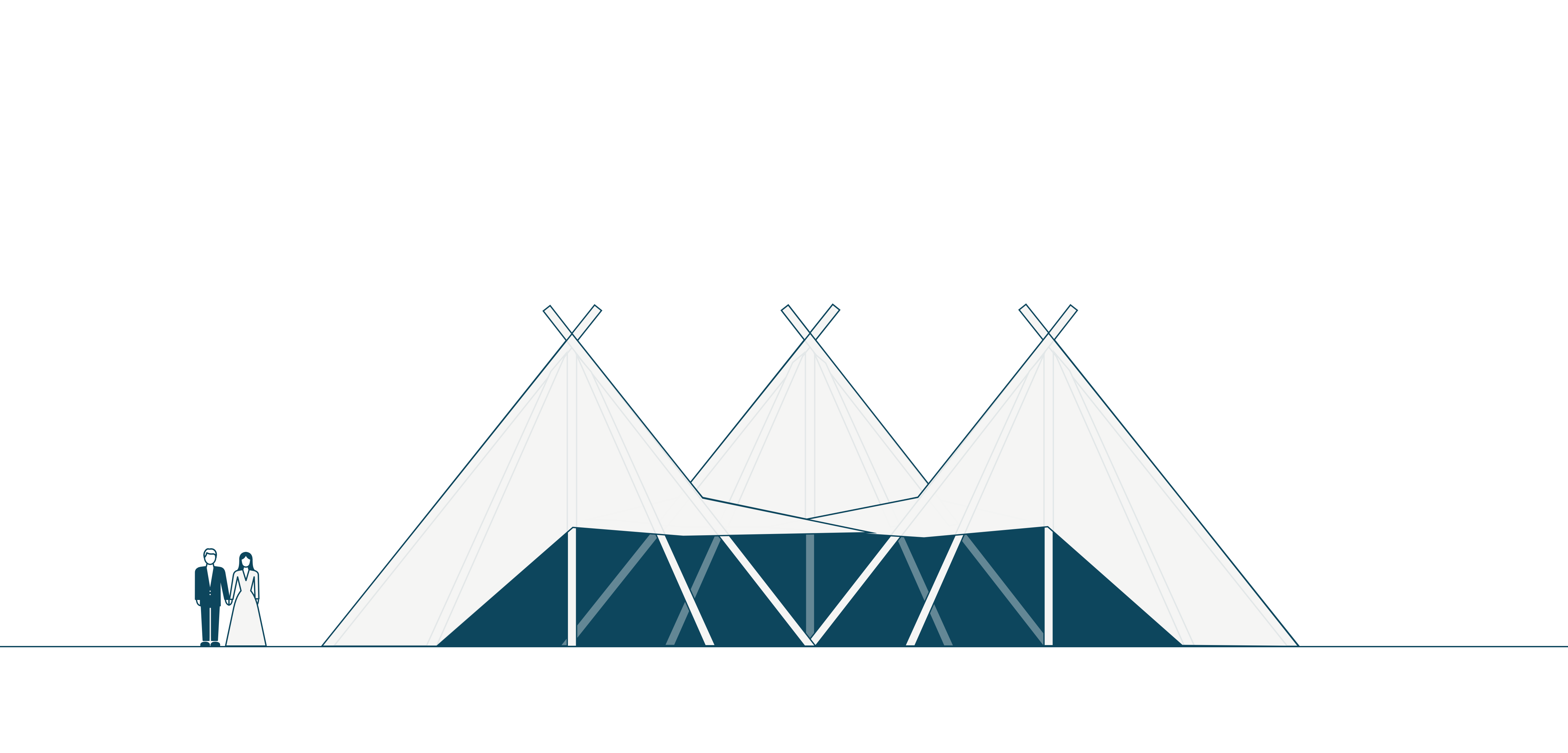 Three tipis with nothing but flooring and simple festoons lights strung up inside, giving you a large, flexible and beautiful covered space for up to 240 people to gather under.
