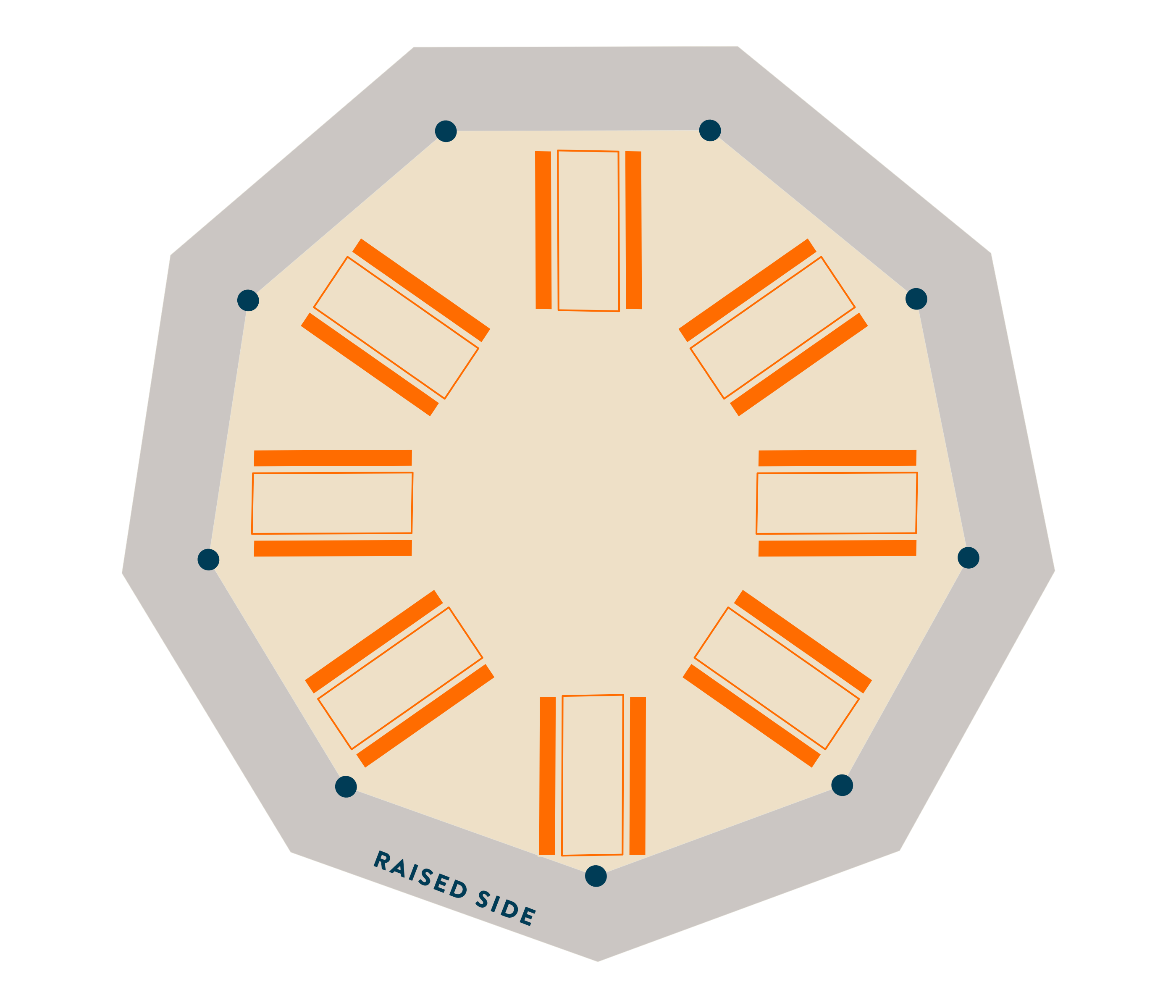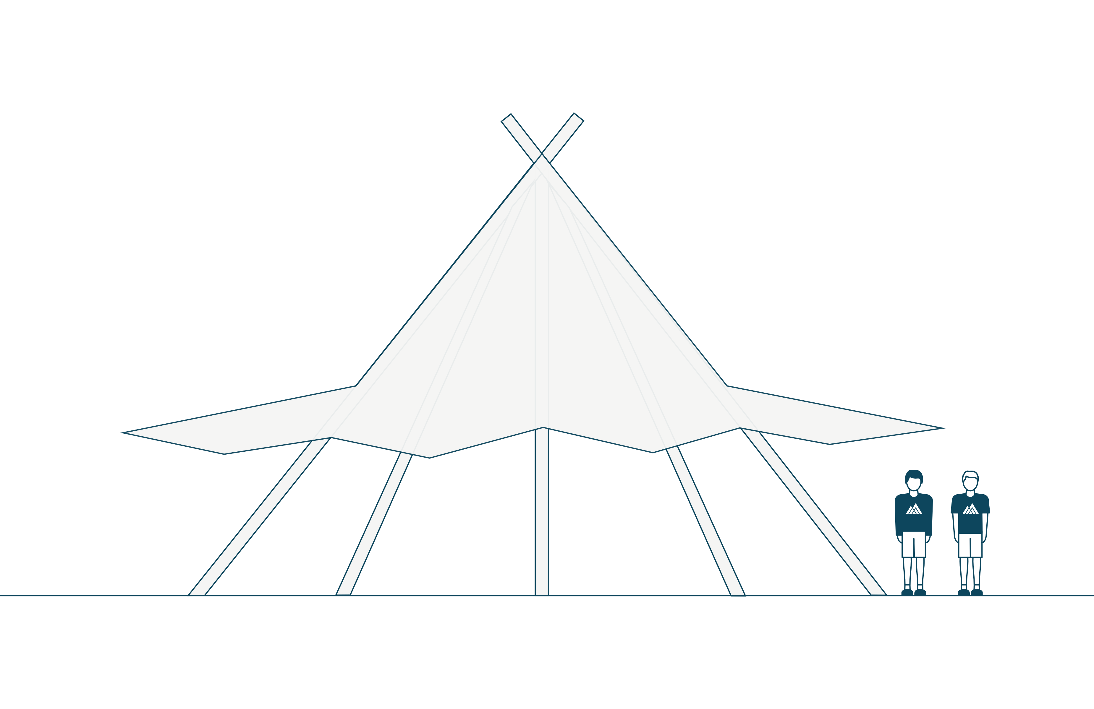 The floor plan shows the tipi with all it's sides raised, creating a wide open shelter for activities to move freely between the indoors and outdoors. Tables are set-up in a dial formation to give space in the middle for demonstrations. As this Collection was intended for daytime summer events, we haven't included lighting or flooring.