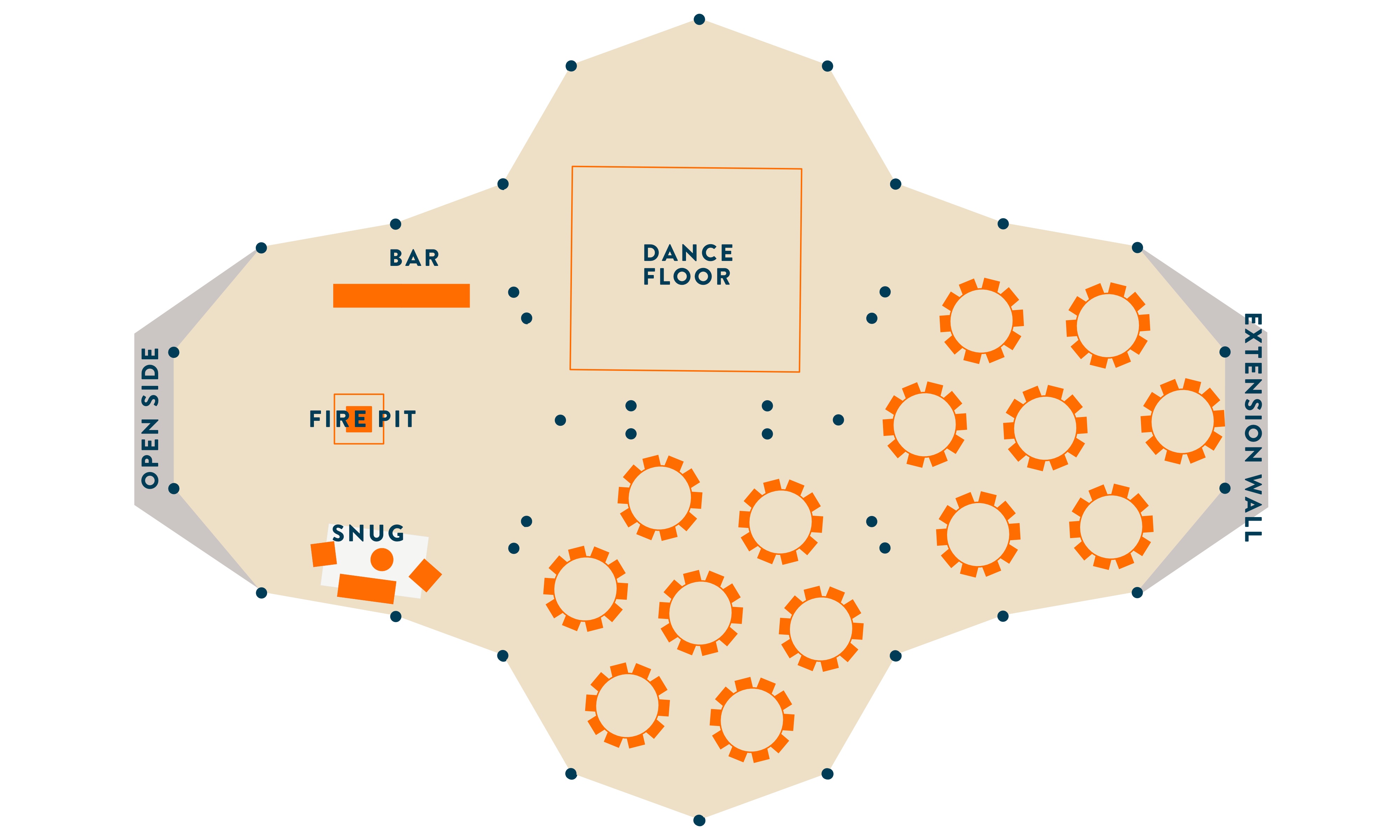 You enter via a bar and fire pit area and the full scale of the diamond-shaped tipi will be immediate. A tipi dedicated to dancing is next the bar tipi and two tipis dedicated to dining look back on the bar and dance floor. We have also added a Window Extension Wall to the back of the tipi, for space and natural light during the day.