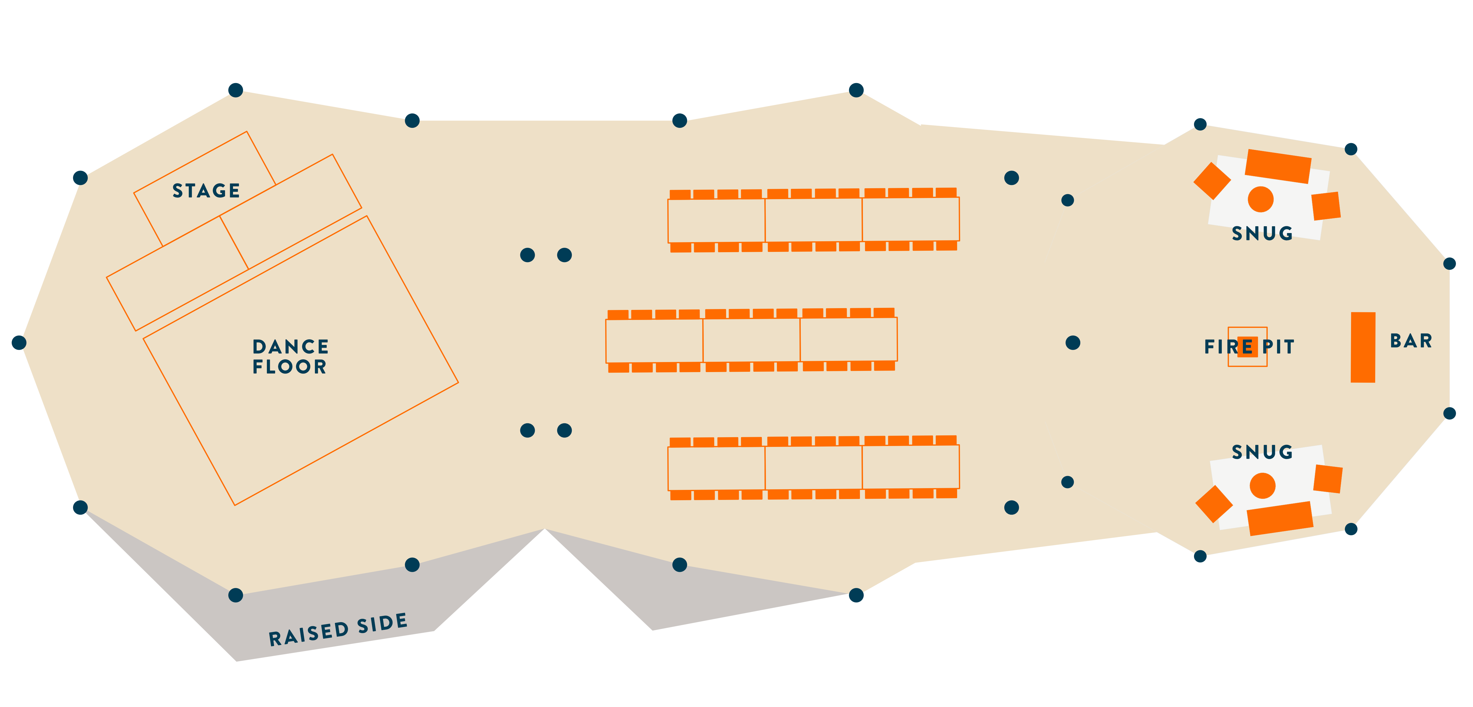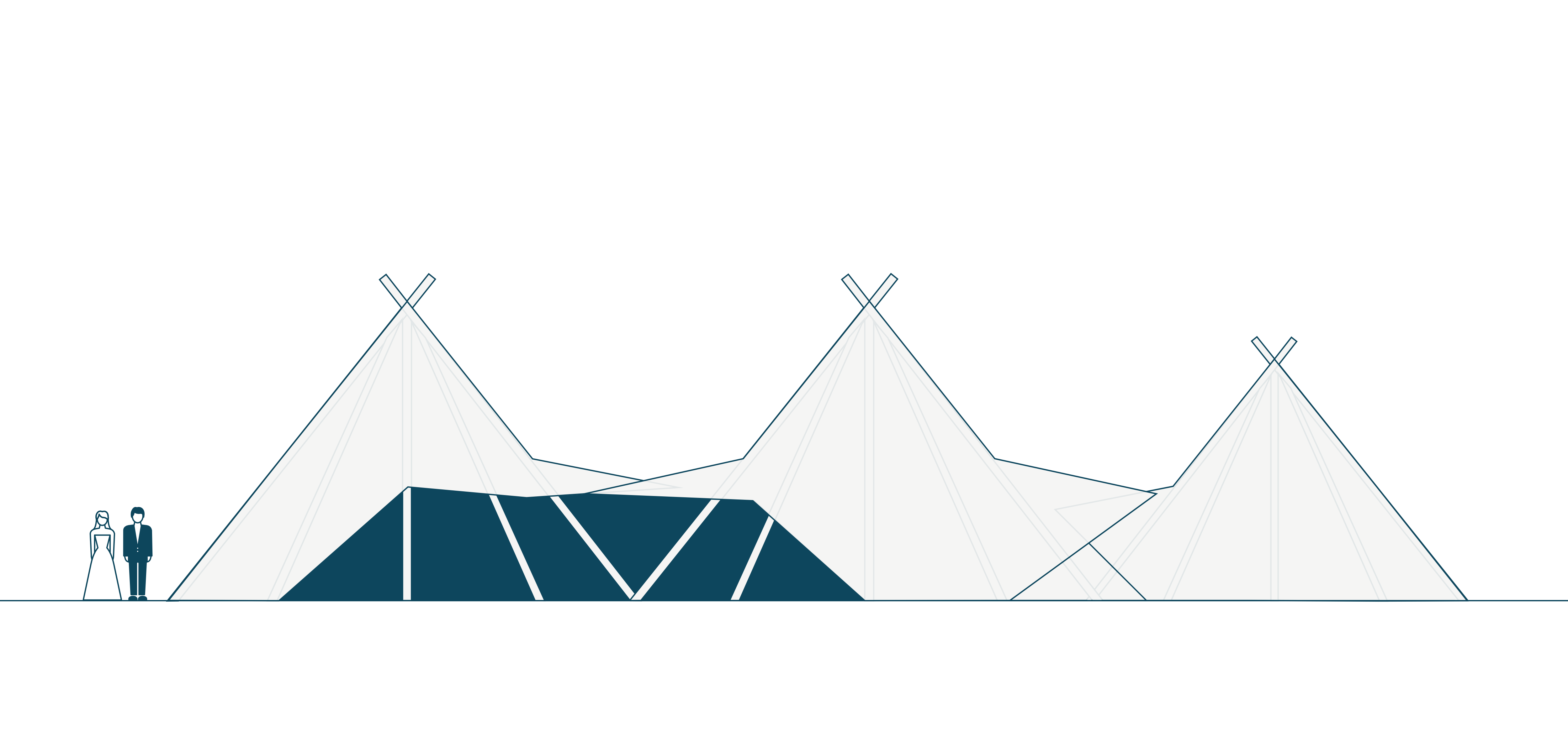 By joining one of our smaller Cirrus tipis to Two Stratus Tipis the Urchfont collection offers enough space for 72 dining guests on trestle tables. Dining aside, there is still plenty of room for a cosy bar area, plus an entire tipi dedicated to dancing.